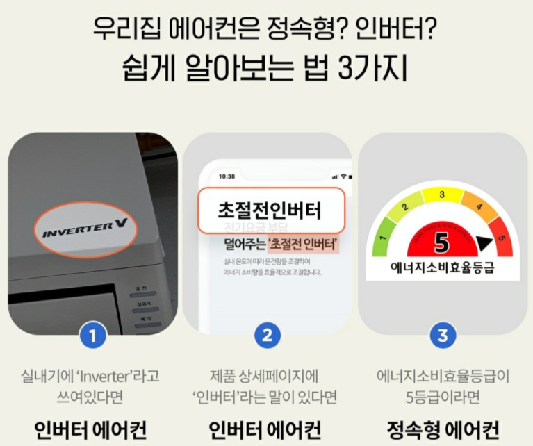 요즘 거의 대부분의 신형 에어컨은 인버터 에어컨입니다. 기기에 쓰여져 있던지 아니면 제품 설명서 등에 인버터라는 말이 있으면 인버터 에어컨입니다. 반대로 정속형 에어컨은 인버터라는 말이 없습니다. 거기에 에너지 소비효율등급이 5등급이면 무조건 인버터 에어컨이 아닌 정속형 에어컨이죠. 그럼 왜 인버터 에어컨이 좋을까요?
