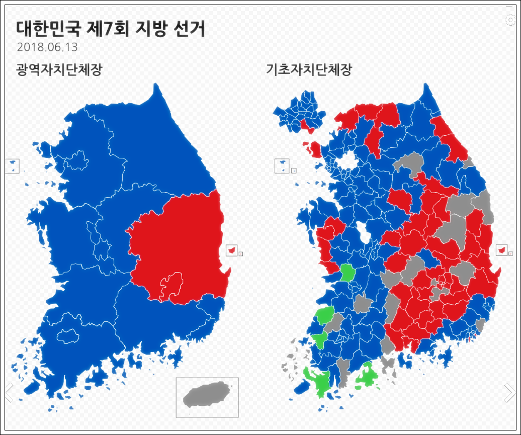 그러다가 1995년 이후부터 4년마다 지금까지 계속해서 이어져오고 있습니다. 참고로 2018년 제7회 지방선거일 결과는 다음과 같았습니다.