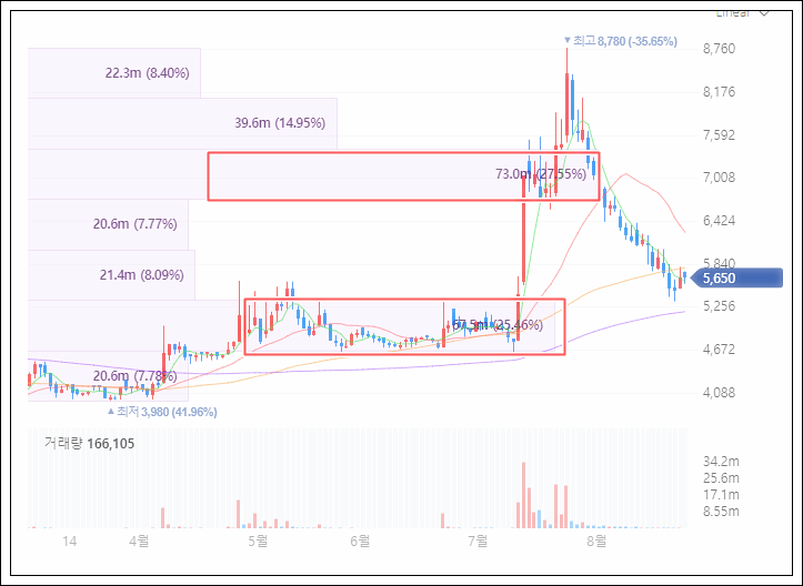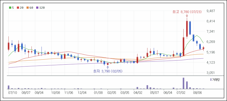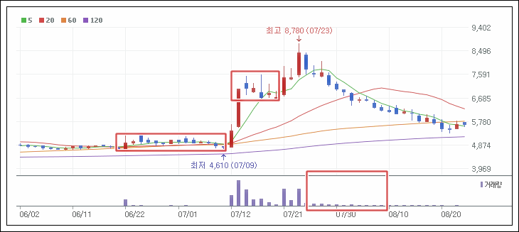 최고점 8,780원을 찍고 현재까지 그냥 주가를 방치하고 있는 상태. 거래량도 없죠. 결론부터 말씀드리면 아직 매집세력, 올린 세력 나가지 않았다 입니다. 이낙연 후보가 경선 결과가 나올때 까지는 아마 몇차례 더 시동을 걸 것으로 보입니다.