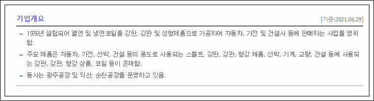 부국철강은 1976년에 시작한 그룹으로 주로 열연, 냉연코일을 강판, 강관 및 성형제품으로 가공하여 판매하는 겁니다. 이 강판들이 자동차, 가전, 건설사 등으로 납품되기에 경기에 따른 영향을 정말 많이 받죠.