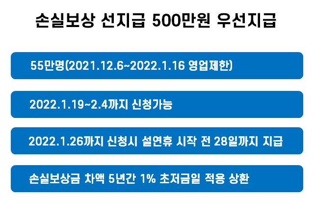 소상공인 손실보상 500만원 선지급 대상은 약 55만명이고 2021년 12월 6일 부터 22년 1월 16일까지 영업제한 조치를 받은 소상공인, 소기업 55만개사가 대상입니다. 이 대상자에 해당하는 분들은 각 분기별(21년 4분기, 22년 1분기) 250만원 씩 총 500만원을 받게 됩니다. 손실보상금이 선지급금보다 작으면 손실보상금으로 차감하고 남은 잔액을 5년간 나눠서 상환할 수 있도록 하였습니다.