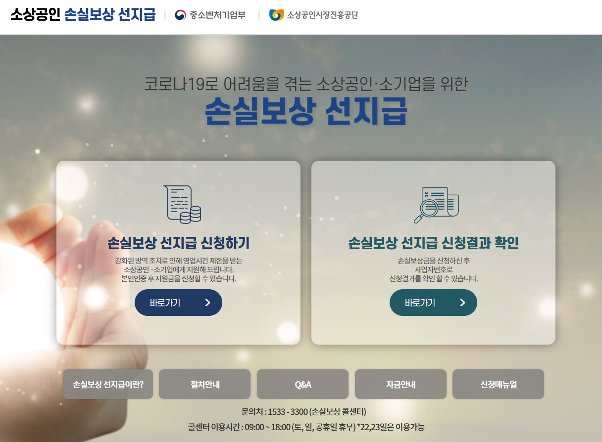 홈페이지 화면입니다. 왼쪽에 손실보상 선지급 신청하기로 가시면 됩니다. 그외 궁금한 것들은 아래 메뉴에서 보시면 되구요.