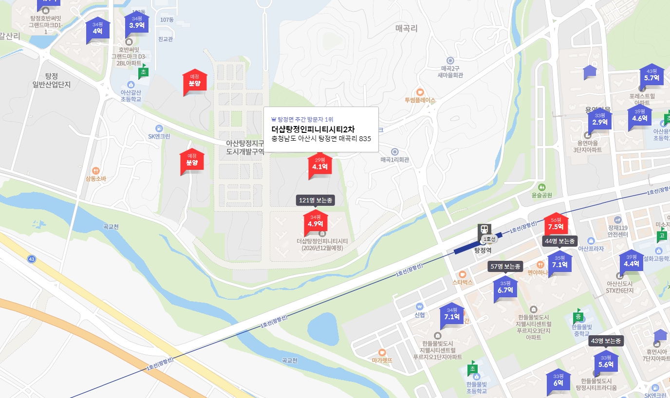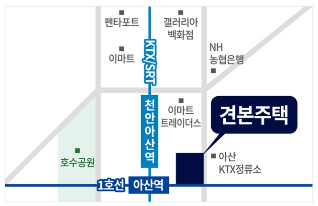 이 아파트가 위치한 곳은 지하철 1호선 탕정역에서 도보로 11분(705m) 거리로, 대중교통 접근성이 매우 뛰어납니다. 또한 KTX와 SRT 정차역인 천안아산역도 2.5km(차량 9분) 정도 떨어져 있어 광역 이동도 편리합니다.