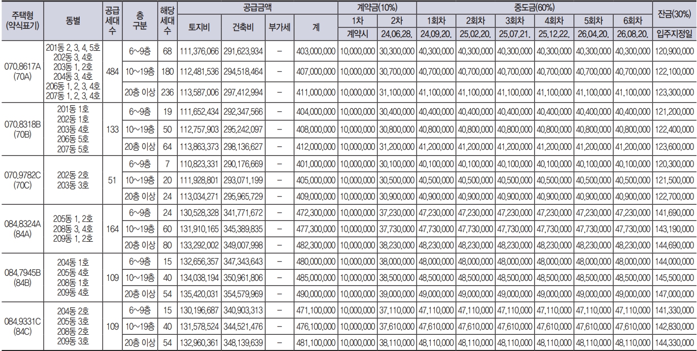 분양가 수준을 보면 전용면적 70㎡대는 4억원 초중반대, 84㎡는 4억8천만원대에 형성되어 있습니다.