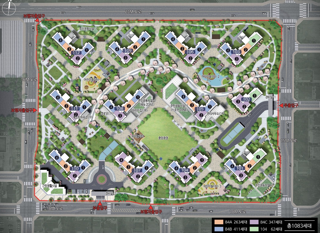 남향 위주 배치로 채광과 통풍이 뛰어나며, 지하주차장은 100% 지하화로 단지 환경을 쾌적하게 조성했습니다. 또한 주동 사이마다 녹지공간과 휴게시설을 마련해 주거 여건을 한층 높일 계획입니다.