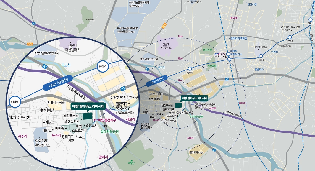 배방산, 곡교천 등 자연환경도 우수하며 곡교천 따라 11.2km 수변문화공간도 조성될 계획입니다. 여기에 더해 단지에서 탕정신도시, 아산신도시, 천안불당신도시, 온양 등 인근 생활권으로의 접근성도 좋습니다.