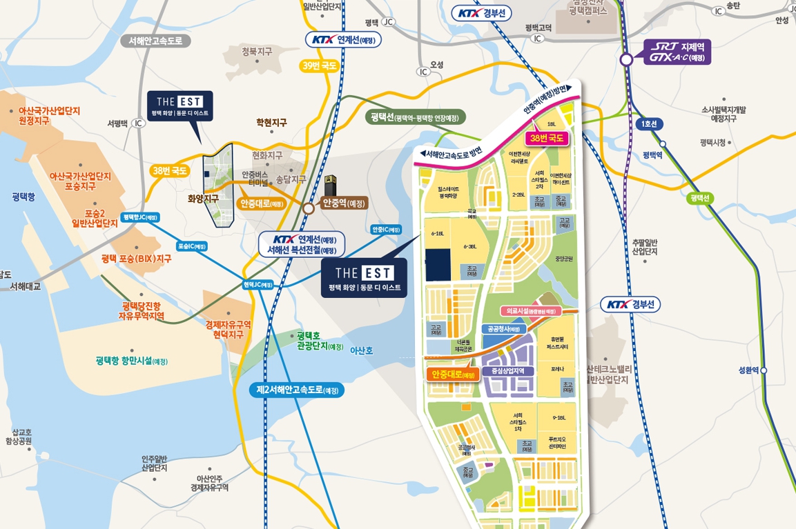 또한 안중역에서 평택선(예정)을 이용하면 평택역까지 연결되어, 서울 지하철 1호선 이용도 용이해집니다. 여기에 평택지제역까지 GTX A·C 노선이 연장 운행하기로 확정되어 더욱 기대감이 높아지고 있습니다.