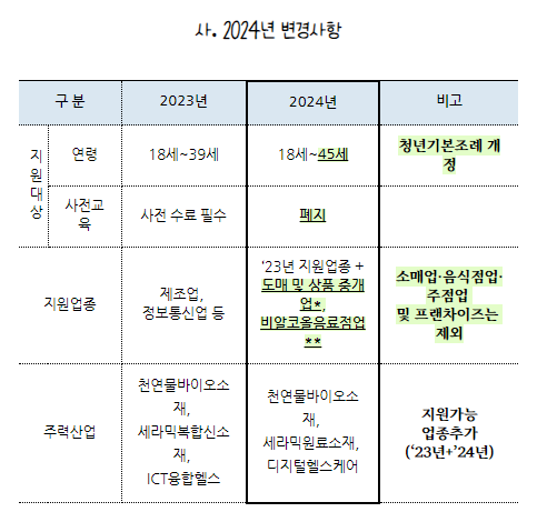 | 지원 업종 | 제조업, 정보통신업 등 | 기존 업종에 더해 일부 도매 및 상품중개업, 비알코올음료점업 추가 |