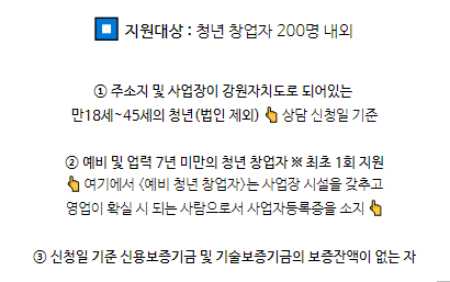 | 지원 대상 | 강원특별자치도 내 거주하는 만 18세 이상 45세 이하 청년 창업자 200명 내외 |