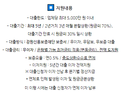 | 관련 문의 | 강원신용보증재단, 협약은행(농협, 신한은행), 강원특별자치도경제진흥원 |