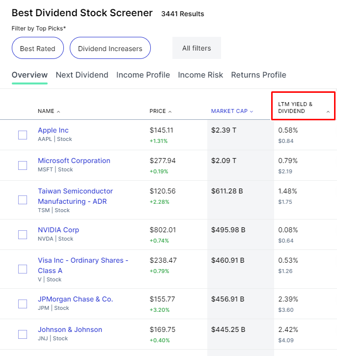 그러면 일단 현재 미국 상장 기업들의 배당금 현황이 간단하게 나오는데요, 그냥 보이는 애플의 경우 시가배당률이 0.5% 정도밖에 되지 않습니다. 이걸 순위대로 정렬하기 위해서는 위에 LTM YIELD % DIVIDEND를 누르시면 됩니다.