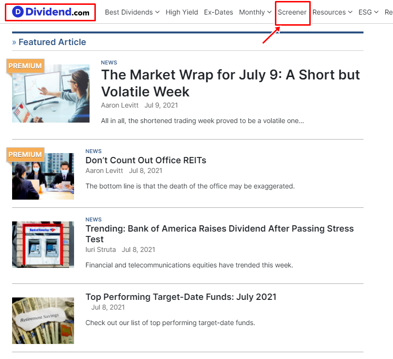 미국 주식에서 제일 깔끔한데는 Seeking Alpha인데 유료더라구요. 그래서 무료로 보는 곳을 알려드리겠습니다. 디비던드닷컴(https://www.dividend.com/)이구요, 배당금에 대한 다양한 자료를 보실 수 있으니 즐겨찾기를 해두셔도 괜찮으실 겁니다. 우리는 미국 주식 배당률 순위를 봐야 하니 위의 메뉴 중에서 Screener를 선택합니다.