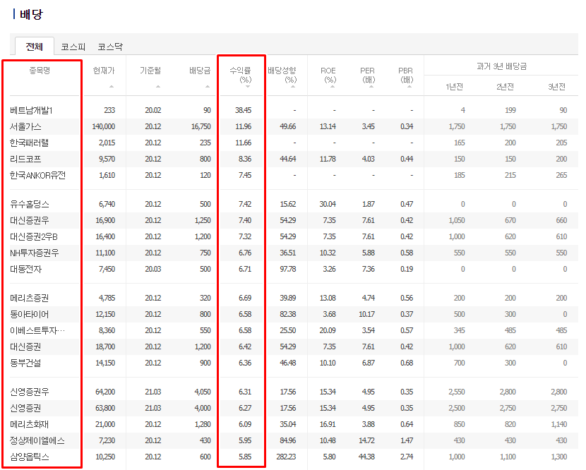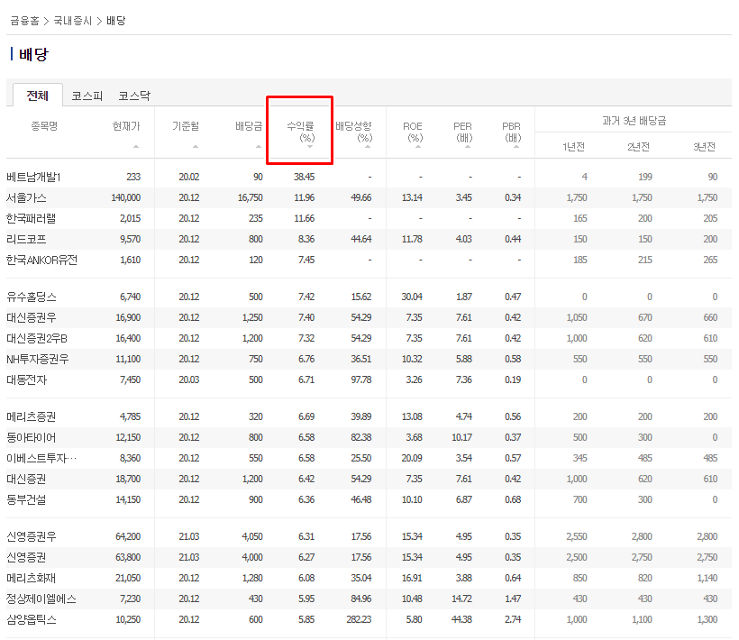 그러면 코스피, 코스닥 전체(나눠서 볼 수도 있습니다) 주식들의 배당금 현황이 나오는데요, 우리가 제일 중요하게 보는건 배당 수익률이니 여기를 클릭하시면 내림차순으로 정렬이 가능합니다.